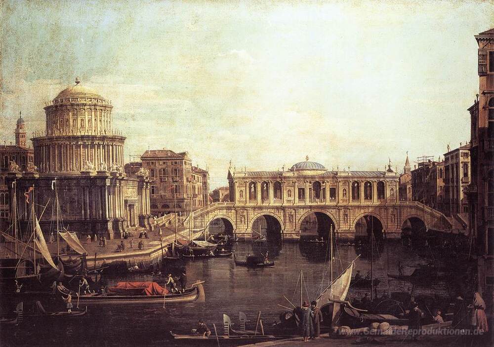 Wir bieten Ihnen eine handgefertigte Reproduktion auf Leinwand des berühmten Kunstwerks 'Capriccio: Der großartige Kanal, mit einem imaginären Rialto-Brü' von Canaletto, aus dem Reproduktionsmuseum.