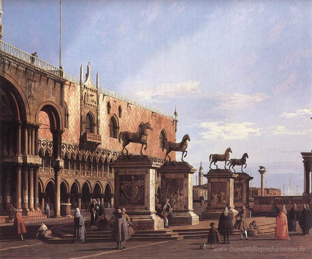 Wir bieten Ihnen eine handgefertigte Reproduktion auf Leinwand des berühmten Kunstwerks 'Capriccio: Die Pferde von San Marco in der Piazzetta' von Canaletto, aus dem Reproduktionsmuseum.