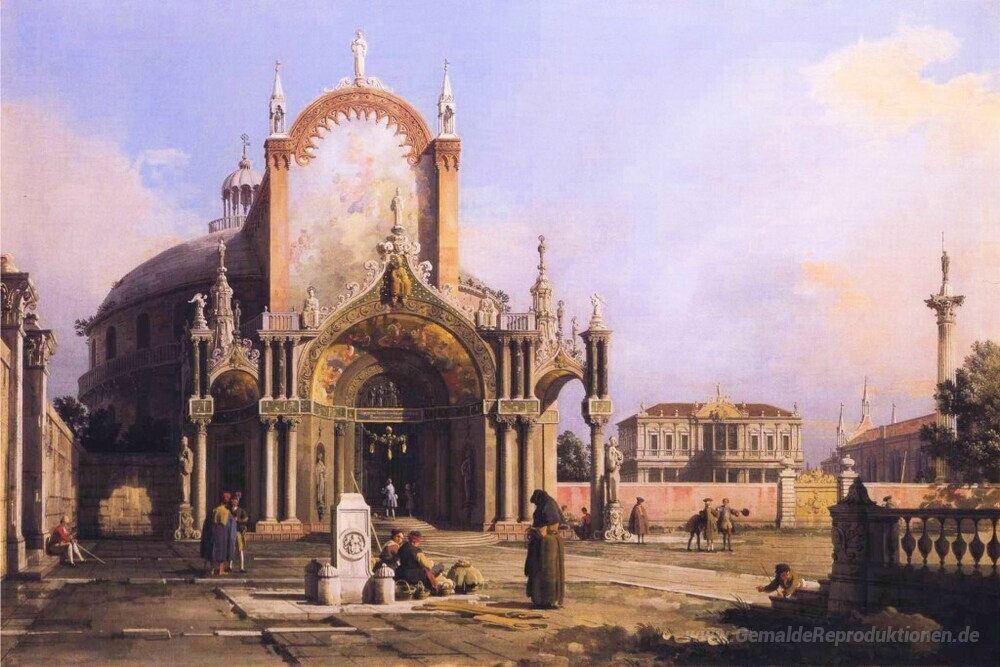 Wir bieten Ihnen eine handgefertigte Reproduktion auf Leinwand des berühmten Kunstwerks 'Capriccio einer Rundkirche mit einer aufwendigen Gothic Portico ' von Canaletto, aus dem Reproduktionsmuseum.