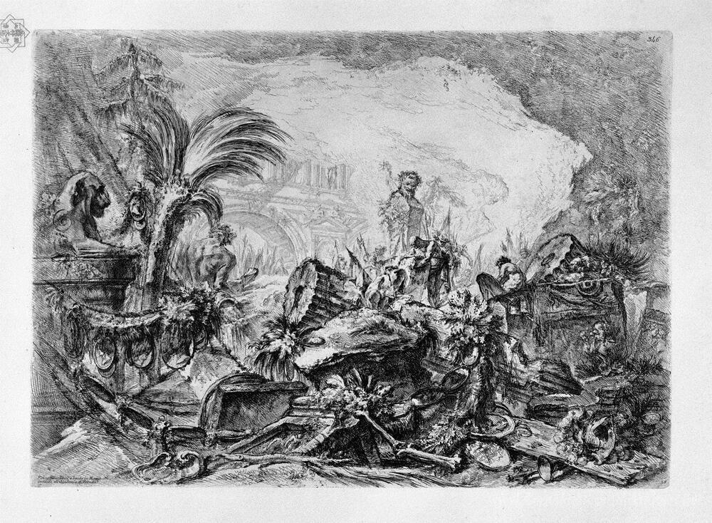 Wir bieten Ihnen eine handgefertigte Reproduktion auf Leinwand des berühmten Kunstwerks 'Caprice dekorative Figuren in der Mitte um einen kleinen Eramo F' von Giovanni Battista Piranesi, aus dem Reproduktionsmuseum.