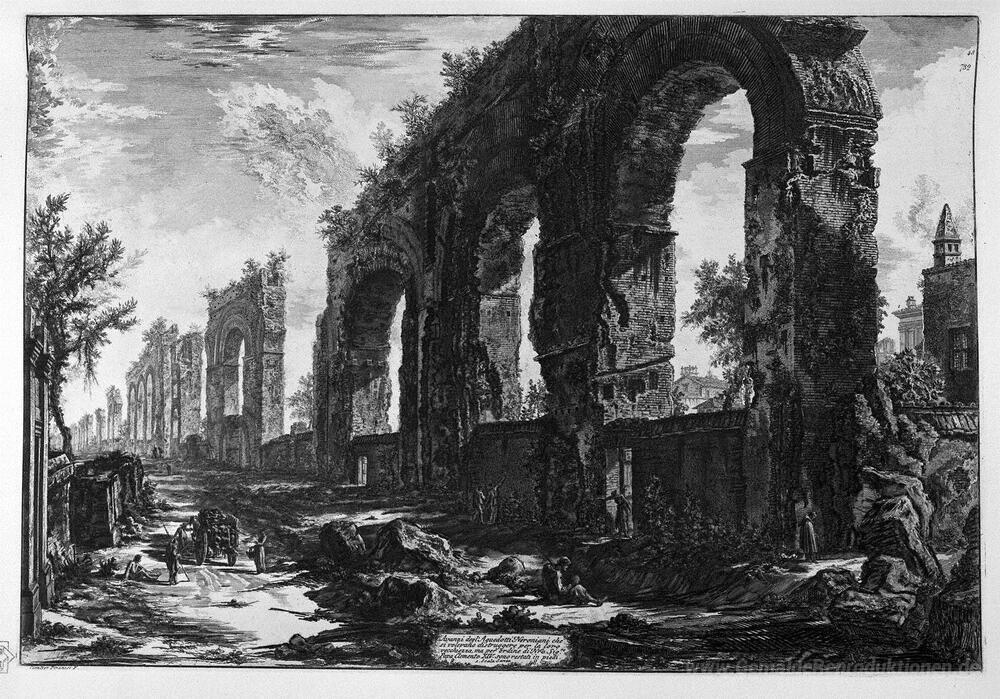 Wir bieten Ihnen eine handgefertigte Reproduktion auf Leinwand des berühmten Kunstwerks 'Ein Blick auf den Fortgang der Wasserburg Julia' von Giovanni Battista Piranesi, aus dem Reproduktionsmuseum.