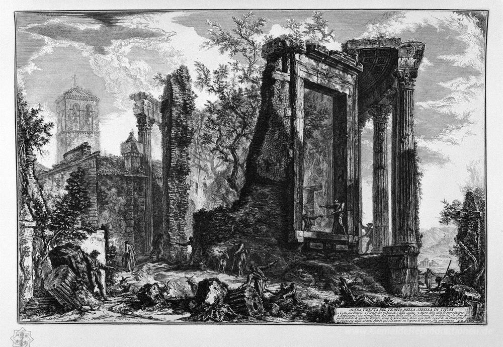 Wir bieten Ihnen eine handgefertigte Reproduktion auf Leinwand des berühmten Kunstwerks 'Ein weiterer Blick auf den Tempel der Sibylle in Tivoli' von Giovanni Battista Piranesi, aus dem Reproduktionsmuseum.