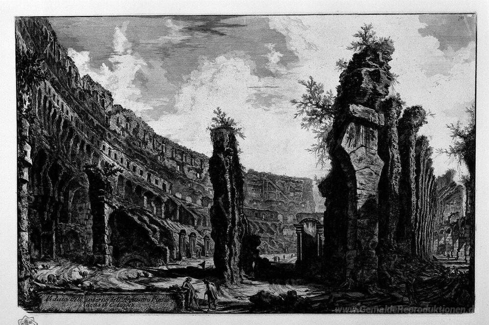 Wir bieten Ihnen eine handgefertigte Reproduktion auf Leinwand des berühmten Kunstwerks 'Innenansicht des Flavian Amphitheatre, genannt das Kolosseum' von Giovanni Battista Piranesi, aus dem Reproduktionsmuseum.