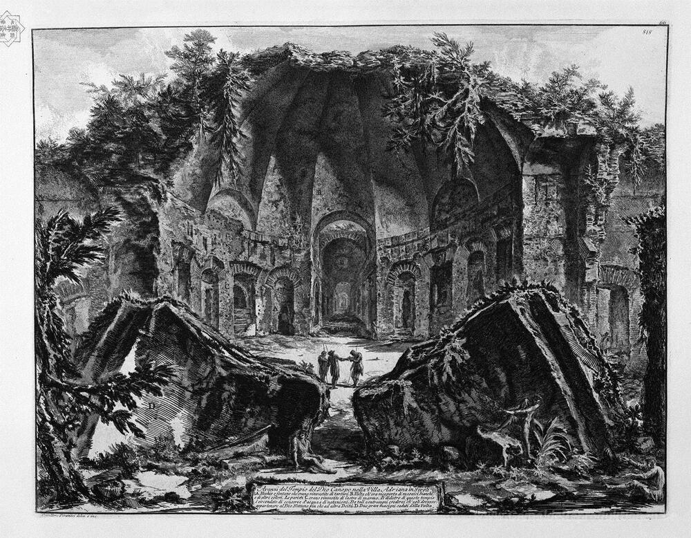 Wir bieten Ihnen eine handgefertigte Reproduktion auf Leinwand des berühmten Kunstwerks 'Reste des Tempels des Gottes Canopus in Titiwangsa, Villa in Tiv' von Giovanni Battista Piranesi, aus dem Reproduktionsmuseum.
