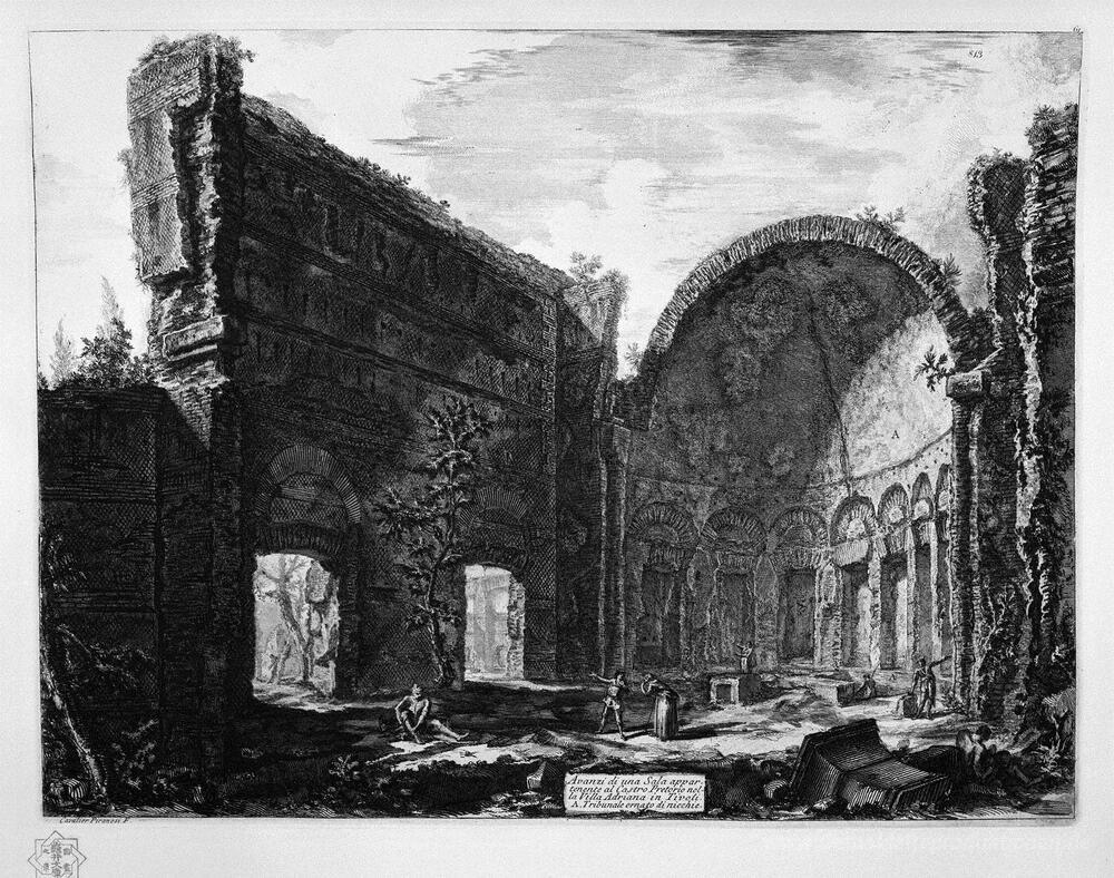 Wir bieten Ihnen eine handgefertigte Reproduktion auf Leinwand des berühmten Kunstwerks 'Reste von einer Halle, die zu der Villa Adriana in Tivoli Castro' von Giovanni Battista Piranesi, aus dem Reproduktionsmuseum.