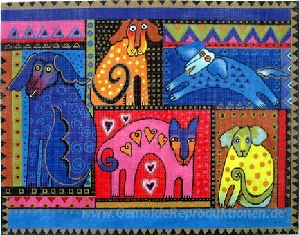 Wir bieten Ihnen eine handgefertigte Reproduktion auf Leinwand des berühmten Kunstwerks 'Dog Quilt' von Laurel Burch, aus dem Reproduktionsmuseum.