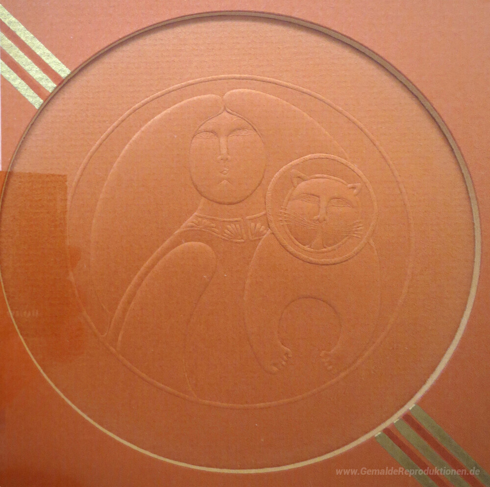 Wir bieten Ihnen eine handgefertigte Reproduktion auf Leinwand des berühmten Kunstwerks 'Frau und Katze (Geprägte Portrait)' von Laurel Burch, aus dem Reproduktionsmuseum.