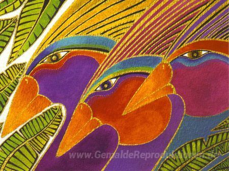 Wir bieten Ihnen eine handgefertigte Reproduktion auf Leinwand des berühmten Kunstwerks 'Vögel von der Rainbow Forest' von Laurel Burch, aus dem Reproduktionsmuseum.