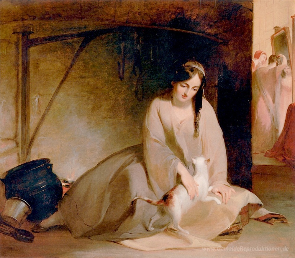 Wir bieten Ihnen eine handgefertigte Reproduktion auf Leinwand des berühmten Kunstwerks 'Cinderella am Küchenfeuer' von Thomas Sully, aus dem Reproduktionsmuseum.