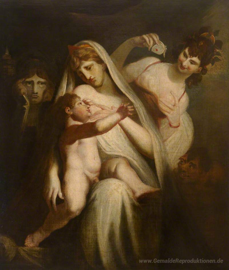 Wir bieten Ihnen eine handgefertigte Reproduktion auf Leinwand des berühmten Kunstwerks 'Der Infant Shakespeare zwischen Tragödie und Komödie' von Henry Fuseli, aus dem Reproduktionsmuseum.