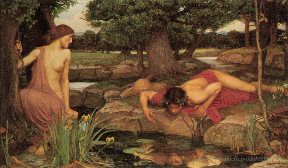 Wir bieten Ihnen eine handgefertigte Reproduktion auf Leinwand des berühmten Kunstwerks 'Echo und Narcissus' von John William Waterhouse, aus dem Reproduktionsmuseum.