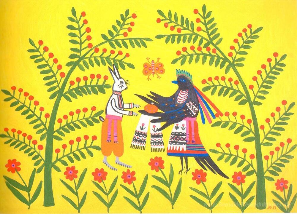 Wir bieten Ihnen eine handgefertigte Reproduktion auf Leinwand des berühmten Kunstwerks 'Ein Hase Geburtstag' von Maria Primachenko, aus dem Reproduktionsmuseum.