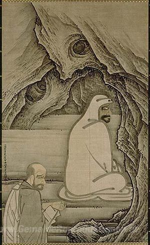 Wir bieten Ihnen eine handgefertigte Reproduktion auf Leinwand des berühmten Kunstwerks 'Huike Mit seinen Arm um Bodhidharma' von Sesshu Toyo, aus dem Reproduktionsmuseum.