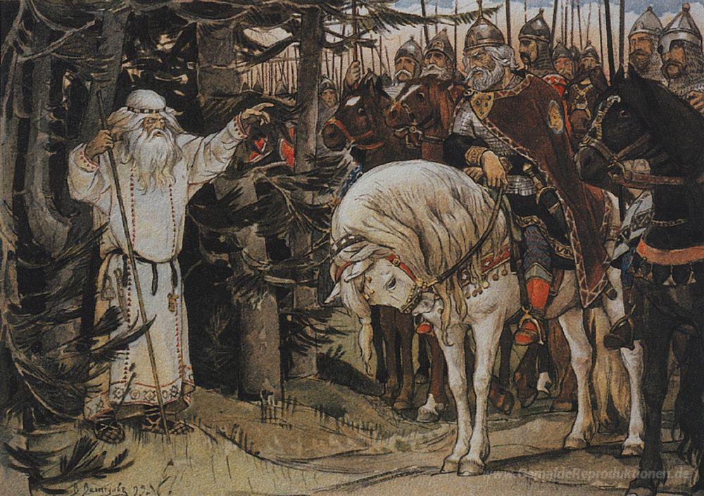 Wir bieten Ihnen eine handgefertigte Reproduktion auf Leinwand des berühmten Kunstwerks 'Oleg erfüllt Assistenten' von Viktor Vasnetsov, aus dem Reproduktionsmuseum.