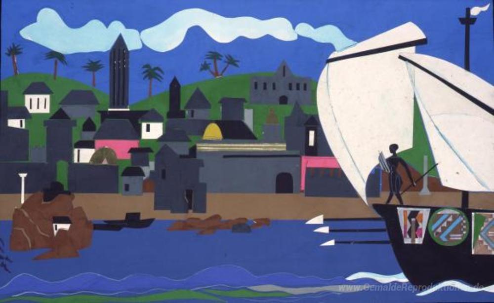 Wir bieten Ihnen eine handgefertigte Reproduktion auf Leinwand des berühmten Kunstwerks 'Startseite nach Ithaca' von Romare Bearden, aus dem Reproduktionsmuseum.