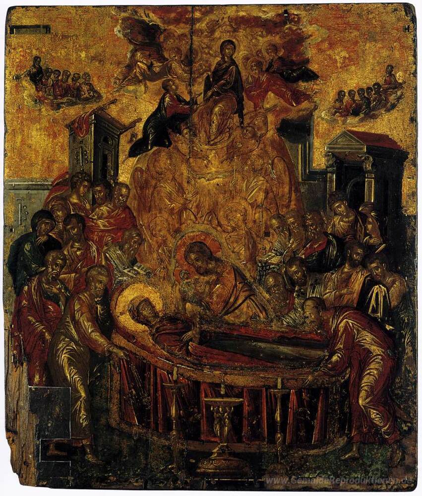 Wir bieten Ihnen eine handgefertigte Reproduktion auf Leinwand des berühmten Kunstwerks 'Entschlafen der Gottesmutter' von El Greco, aus dem Reproduktionsmuseum.