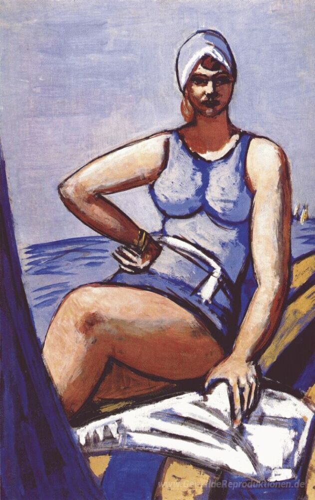 Wir bieten Ihnen eine handgefertigte Reproduktion auf Leinwand des berühmten Kunstwerks 'Quappi in Blau in einem Boot' von Max Beckmann, aus dem Reproduktionsmuseum.