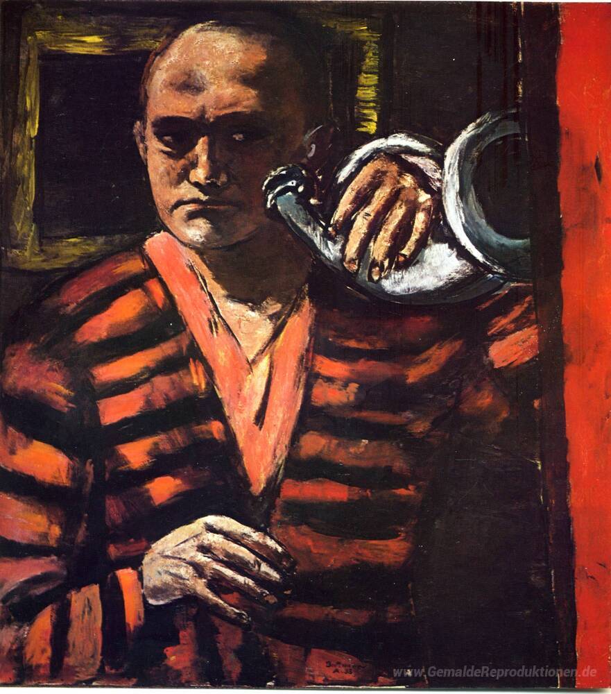 Wir bieten Ihnen eine handgefertigte Reproduktion auf Leinwand des berühmten Kunstwerks 'Selbstporträt mit Trompete' von Max Beckmann, aus dem Reproduktionsmuseum.