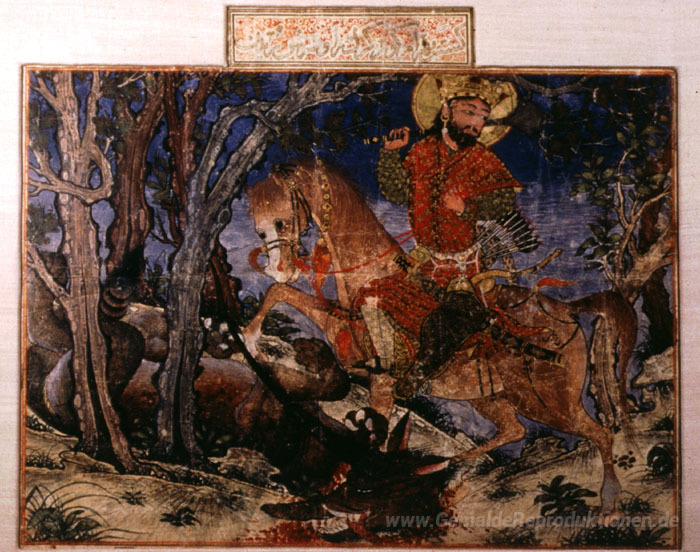 Wir bieten Ihnen eine handgefertigte Reproduktion auf Leinwand des berühmten Kunstwerks 'Bahram Gur tötet den Wolf' von Ahmad Musa, aus dem Reproduktionsmuseum.