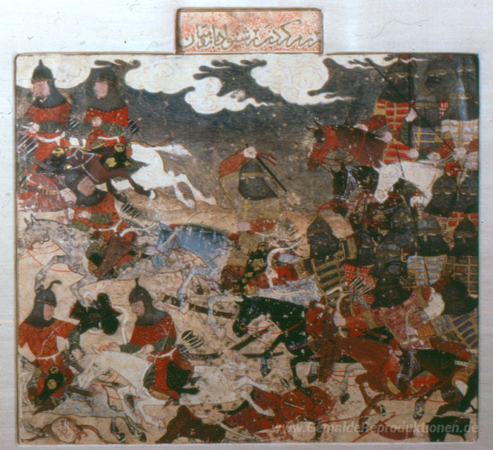 Wir bieten Ihnen eine handgefertigte Reproduktion auf Leinwand des berühmten Kunstwerks 'Darab und Rastnawan kämpfen die Rumis' von Ahmad Musa, aus dem Reproduktionsmuseum.