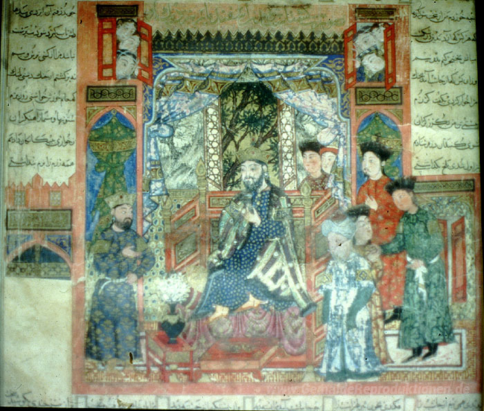 Wir bieten Ihnen eine handgefertigte Reproduktion auf Leinwand des berühmten Kunstwerks 'Isfandiyar nähert Gushtasp' von Ahmad Musa, aus dem Reproduktionsmuseum.