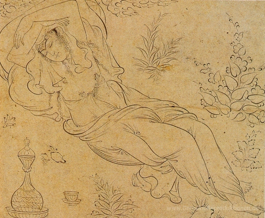 Wir bieten Ihnen eine handgefertigte Reproduktion auf Leinwand des berühmten Kunstwerks 'Liegende Frau' von Reza Abbasi, aus dem Reproduktionsmuseum.