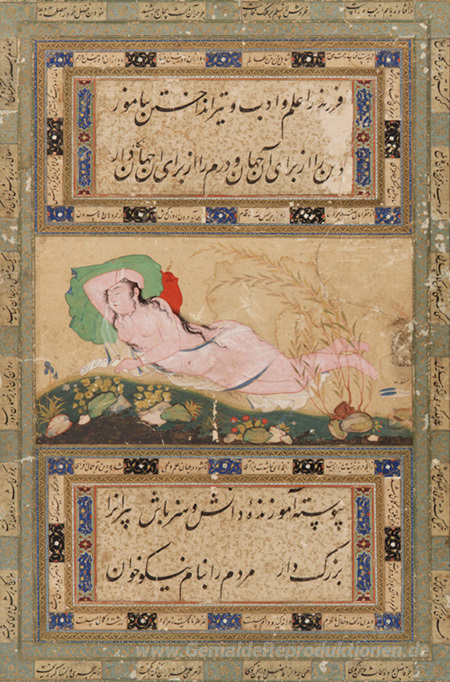 Wir bieten Ihnen eine handgefertigte Reproduktion auf Leinwand des berühmten Kunstwerks 'Reclining Nude' von Reza Abbasi, aus dem Reproduktionsmuseum.