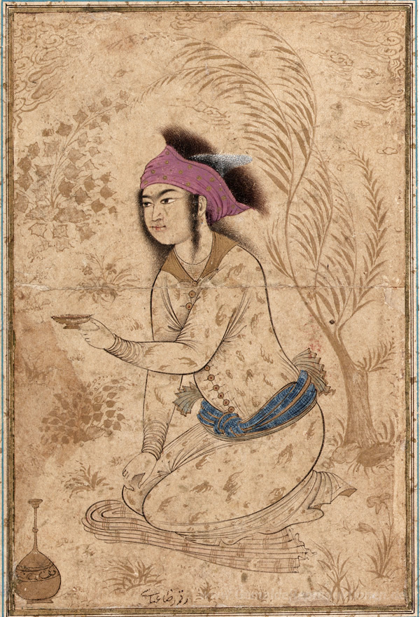 Wir bieten Ihnen eine handgefertigte Reproduktion auf Leinwand des berühmten Kunstwerks 'Youth kniend und hielt ihm eine Weinbecher' von Reza Abbasi, aus dem Reproduktionsmuseum.