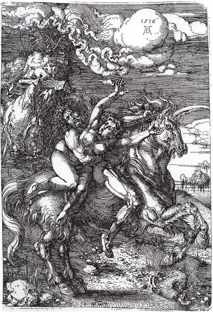 Wir bieten Ihnen eine handgefertigte Reproduktion auf Leinwand des berühmten Kunstwerks 'Abduktion von Proserpine auf einem Einhorn' von Albrecht Durer, aus dem Reproduktionsmuseum.
