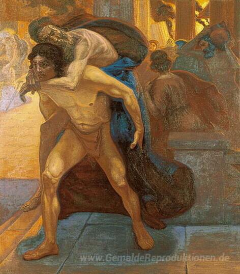 Wir bieten Ihnen eine handgefertigte Reproduktion auf Leinwand des berühmten Kunstwerks 'Aeneas Rettung seines Vaters durch die Flammen von Troja' von Emmanuel Zairis, aus dem Reproduktionsmuseum.