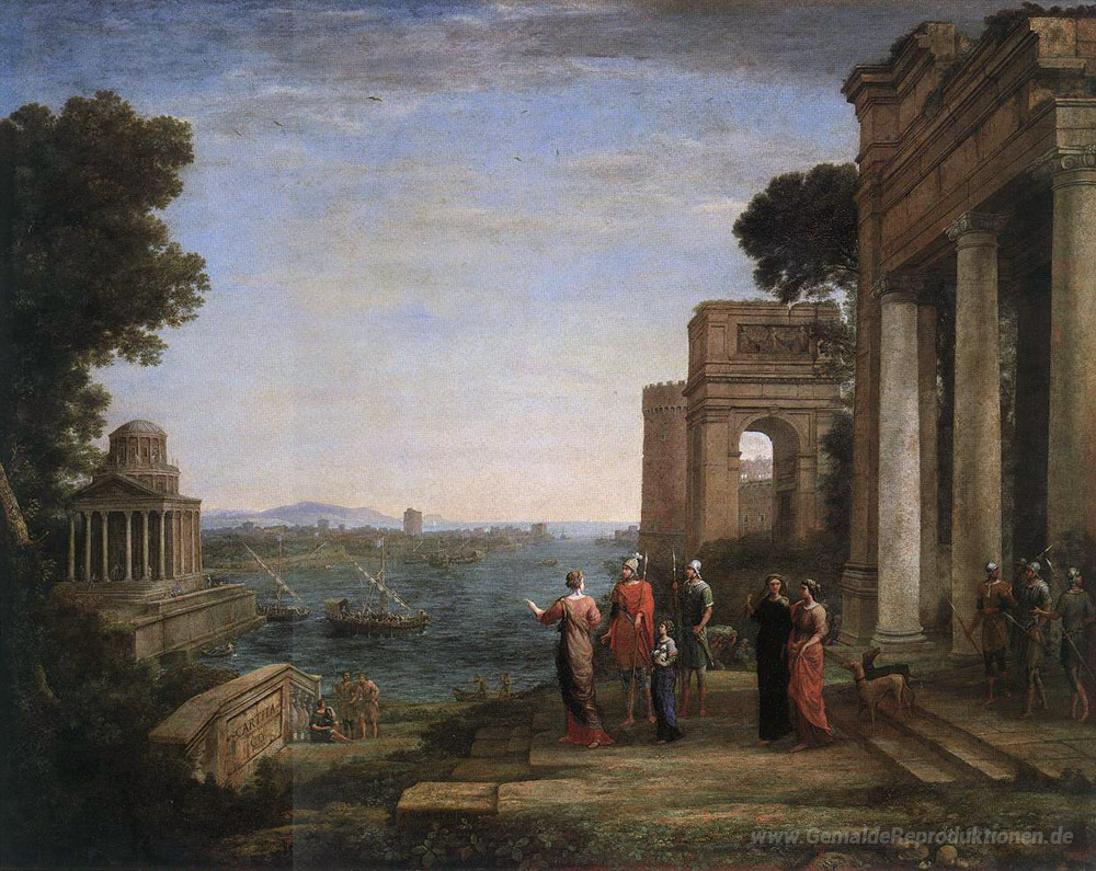 Wir bieten Ihnen eine handgefertigte Reproduktion auf Leinwand des berühmten Kunstwerks 'Aeneas und Dido in Karthago' von Claude Lorrain, aus dem Reproduktionsmuseum.