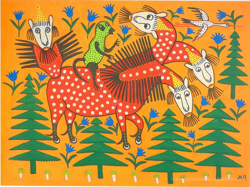 Wir bieten Ihnen eine handgefertigte Reproduktion auf Leinwand des berühmten Kunstwerks 'Affe-Reiten ein Vier-Headed Beast' von Maria Primachenko, aus dem Reproduktionsmuseum.