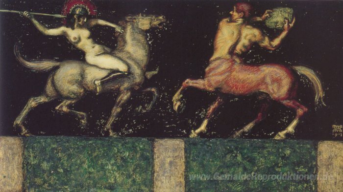 Wir bieten Ihnen eine handgefertigte Reproduktion auf Leinwand des berühmten Kunstwerks 'Amazon und Centaur' von Franz Stuck, aus dem Reproduktionsmuseum.