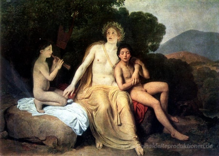 Wir bieten Ihnen eine handgefertigte Reproduktion auf Leinwand des berühmten Kunstwerks 'Apollo, Hyacinthus und Cyparis Singen und Spielen' von Alexander Ivanov, aus dem Reproduktionsmuseum.