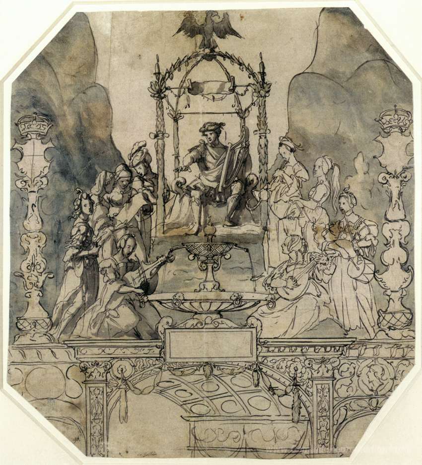 Wir bieten Ihnen eine handgefertigte Reproduktion auf Leinwand des berühmten Kunstwerks 'Apollo und die Musen auf dem Parnass' von Hans Holbein the Younger, aus dem Reproduktionsmuseum.