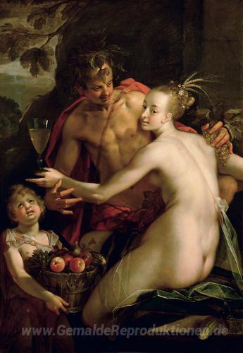 Wir bieten Ihnen eine handgefertigte Reproduktion auf Leinwand des berühmten Kunstwerks 'Bacchus, Ceres und Amor' von Hans von Aachen, aus dem Reproduktionsmuseum.