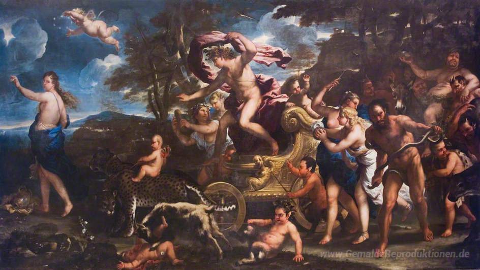 Wir bieten Ihnen eine handgefertigte Reproduktion auf Leinwand des berühmten Kunstwerks 'Bacchus und Ariadne' von Luca Giordano, aus dem Reproduktionsmuseum.