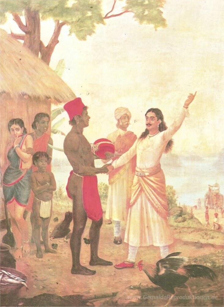 Wir bieten Ihnen eine handgefertigte Reproduktion auf Leinwand des berühmten Kunstwerks 'Bheeshma Eid' von Raja Ravi Varma, aus dem Reproduktionsmuseum.