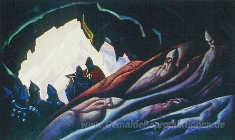 Wir bieten Ihnen eine handgefertigte Reproduktion auf Leinwand des berühmten Kunstwerks 'Bogatyrs wachte' von Nicholas Roerich, aus dem Reproduktionsmuseum.