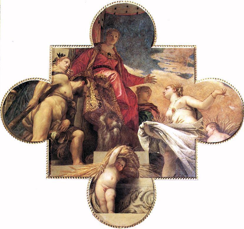 Wir bieten Ihnen eine handgefertigte Reproduktion auf Leinwand des berühmten Kunstwerks 'Ceres huldigt Venedig' von Paolo Veronese, aus dem Reproduktionsmuseum.
