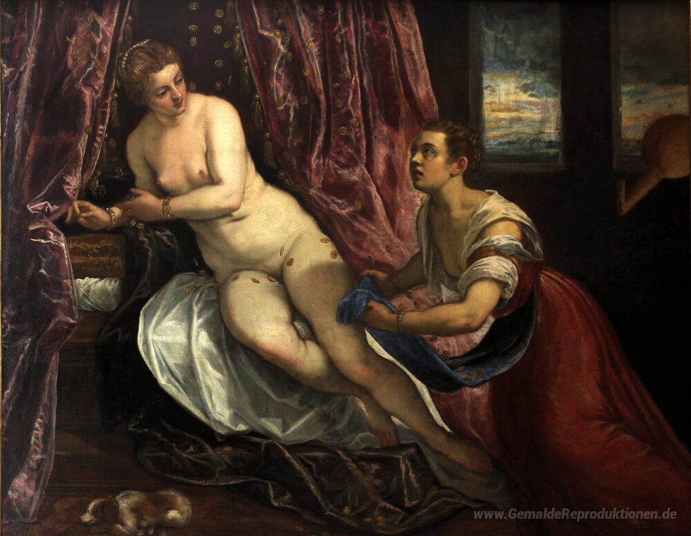 Wir bieten Ihnen eine handgefertigte Reproduktion auf Leinwand des berühmten Kunstwerks 'Danae' von Tintoretto, aus dem Reproduktionsmuseum.