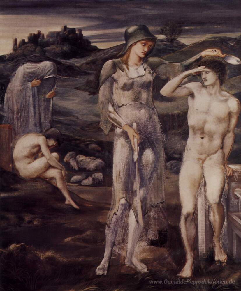 Wir bieten Ihnen eine handgefertigte Reproduktion auf Leinwand des berühmten Kunstwerks 'Das Nennen von Perseus' von Edward Burne-Jones, aus dem Reproduktionsmuseum.