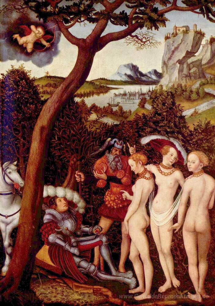 Wir bieten Ihnen eine handgefertigte Reproduktion auf Leinwand des berühmten Kunstwerks 'Das Urteil des Paris' von Lucas Cranach the Elder, aus dem Reproduktionsmuseum.