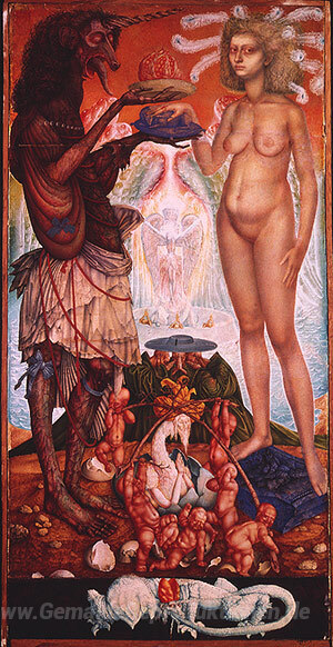 Wir bieten Ihnen eine handgefertigte Reproduktion auf Leinwand des berühmten Kunstwerks 'Der Hochzeit des UNICHORN' von Ernst Fuchs, aus dem Reproduktionsmuseum.