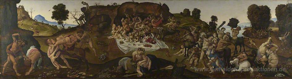 Wir bieten Ihnen eine handgefertigte Reproduktion auf Leinwand des berühmten Kunstwerks 'Der Kampf zwischen den Lapithen und Kentauren' von Piero di Cosimo, aus dem Reproduktionsmuseum.