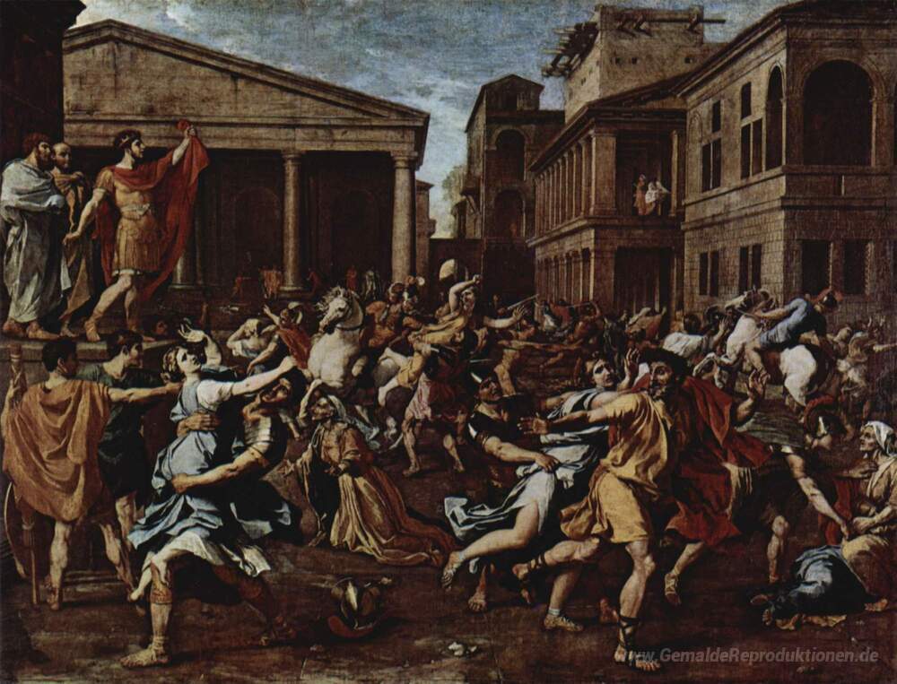 Wir bieten Ihnen eine handgefertigte Reproduktion auf Leinwand des berühmten Kunstwerks 'Der Raub der Sabinerinnen' von Nicolas Poussin, aus dem Reproduktionsmuseum.
