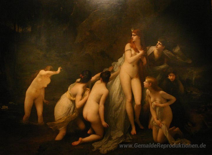 Wir bieten Ihnen eine handgefertigte Reproduktion auf Leinwand des berühmten Kunstwerks 'Diana Überrascht' von Jules Joseph Lefebvre, aus dem Reproduktionsmuseum.