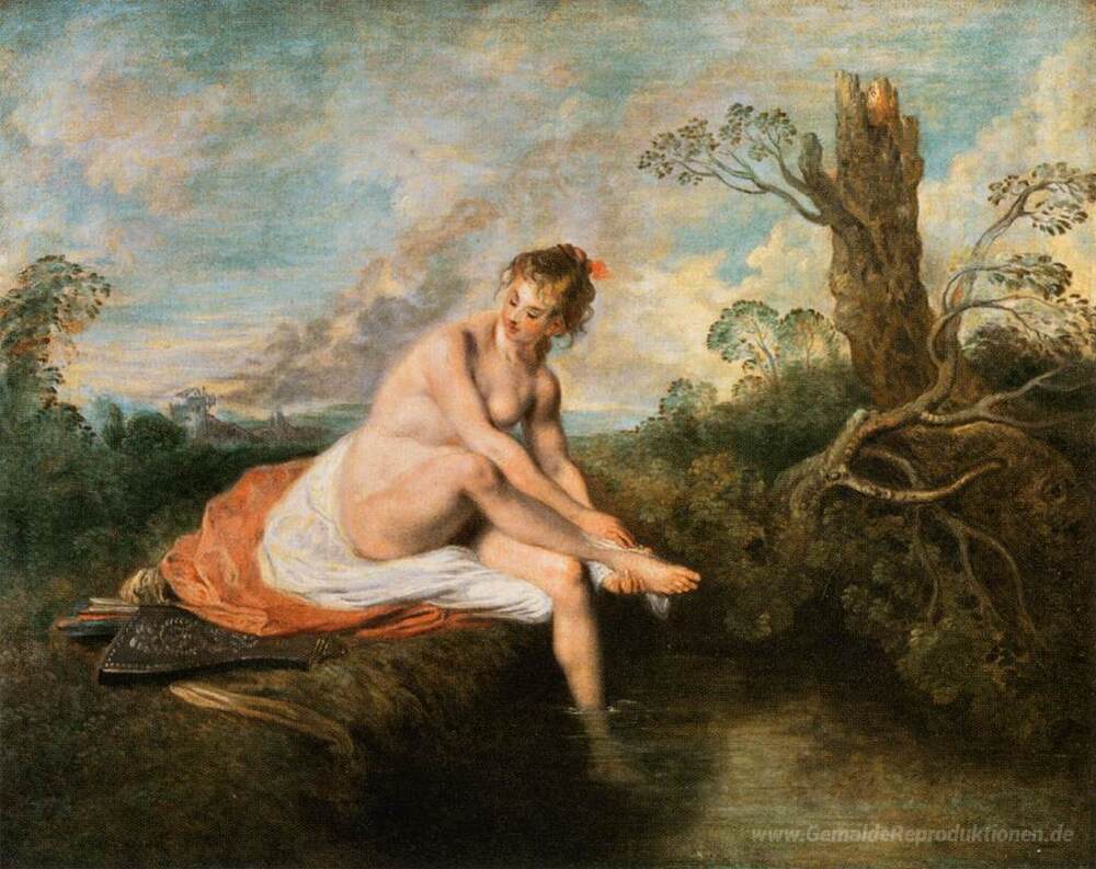 Wir bieten Ihnen eine handgefertigte Reproduktion auf Leinwand des berühmten Kunstwerks 'Diana auf ihre Bath' von Antoine Watteau, aus dem Reproduktionsmuseum.