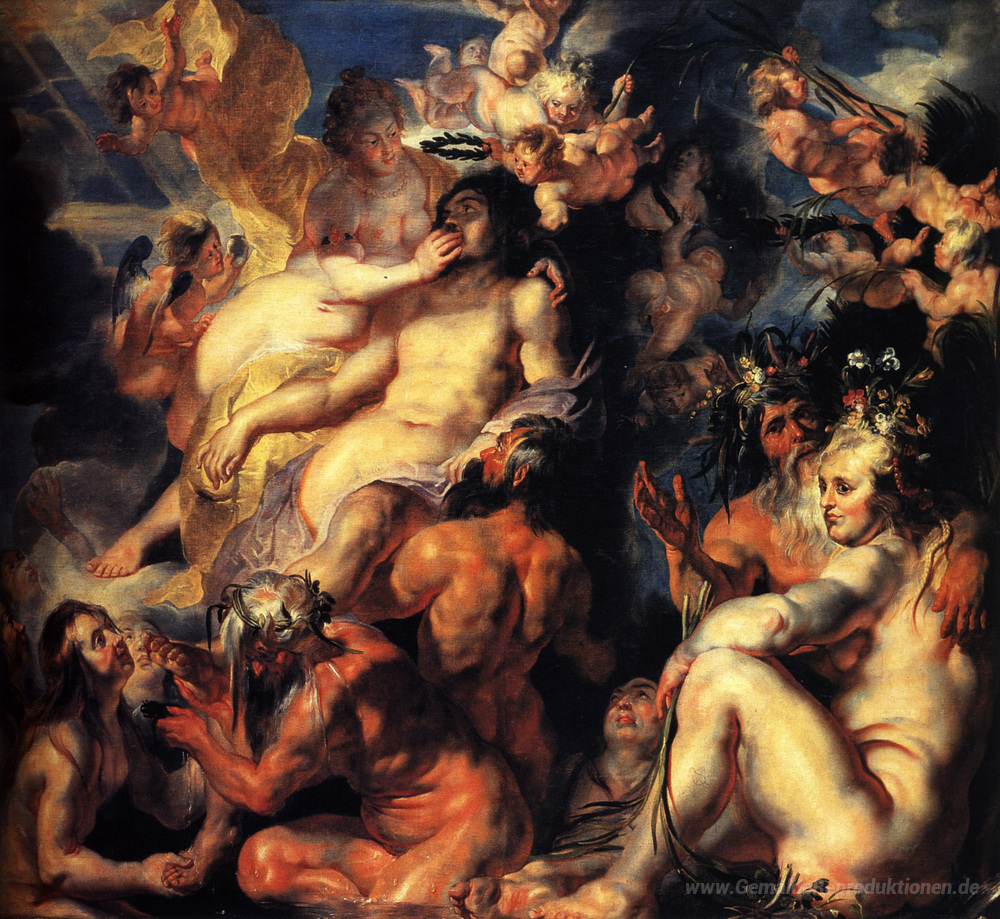 Wir bieten Ihnen eine handgefertigte Reproduktion auf Leinwand des berühmten Kunstwerks 'Die Apotheose des Aeneas' von Jacob Jordaens, aus dem Reproduktionsmuseum.