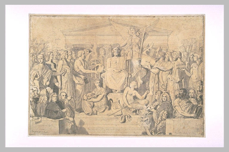 Wir bieten Ihnen eine handgefertigte Reproduktion auf Leinwand des berühmten Kunstwerks 'Die Apotheose des Homer' von Jean Auguste Dominique Ingres, aus dem Reproduktionsmuseum.